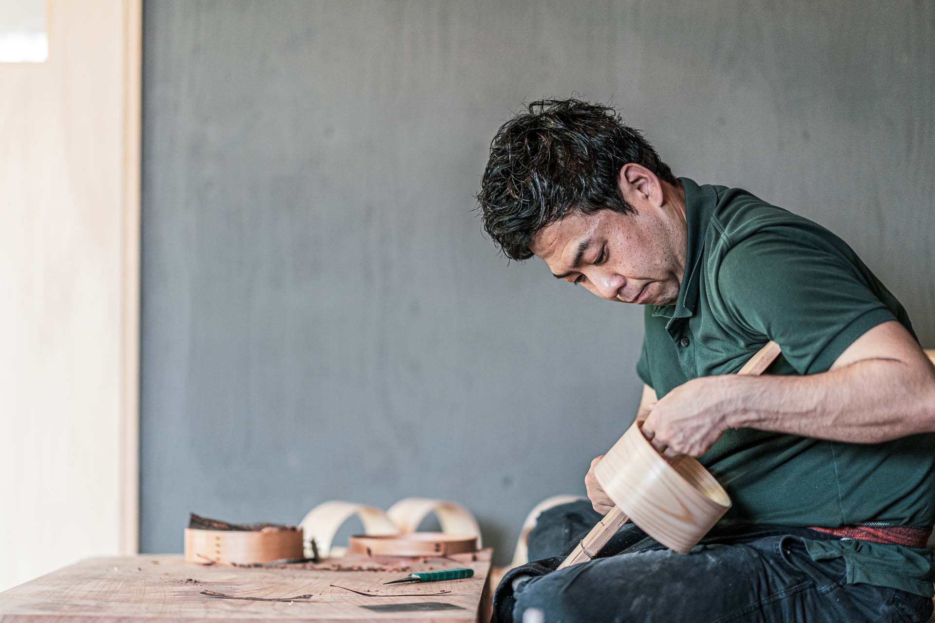 曲物工房清水 清水貴康さん 大学卒業後、地元の信用金庫に10年間勤務。その後、モノづくりに従事する職人が軒並み減少しているという現実に直面し、その一助になればと考え、岐阜県立森林文化アカデミーに入学。在学中に曲物に出会い、曲物職人を目指す。